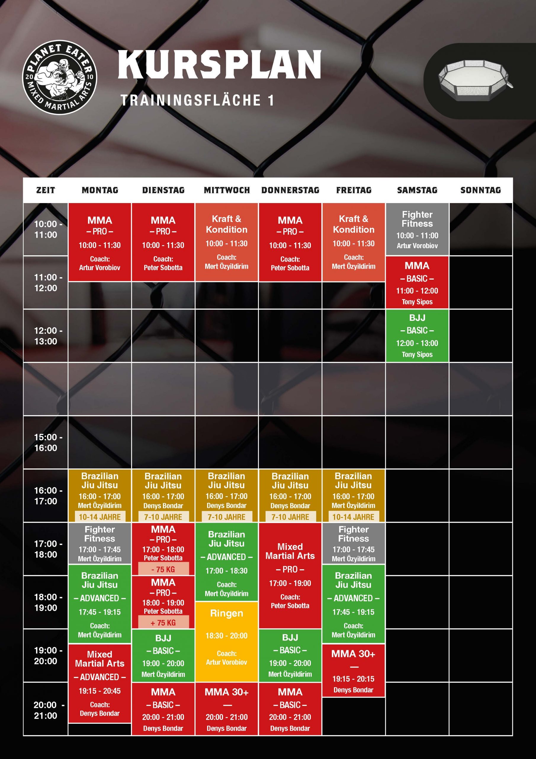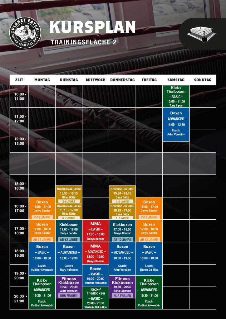 Kursplan Kursplan Unser Kursplan Hier findest du unseren Kursplan (auch zum Download). Probetraining vereinbaren Kursplan Download Personal Training – Maximal effizientes Training– Individuelle und zielgerichtete 1:1 Betreuung– Flexible Trainingszeiten – Weltklasse Trainer Anfrage senden Trainingslager – Trainiere mit einem der besten MMA Teams in Europa– Insgesamt drei Gästezimmer direkt im Gym– Voll ausgestatte Küche– Einkaufsmöglichkeiten und Bahnhof zu Fuß erreichbar Anfrage senden